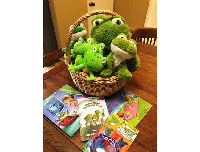 If you children like frogs they will love this basket. The Frog Family consists of a charming large green frog father who likes hugs, a green mother frog with a great smile and her teenage son also, with a lovely smile and three young, adorable frog children looking for an adventure. This basket also includes a frog game, three small green rubber frogs for the bath and a frog boat toy for the bath and three wonderful books, Froggy’s Baby Sister, Days with Frog and Toad and The Frog Prince.