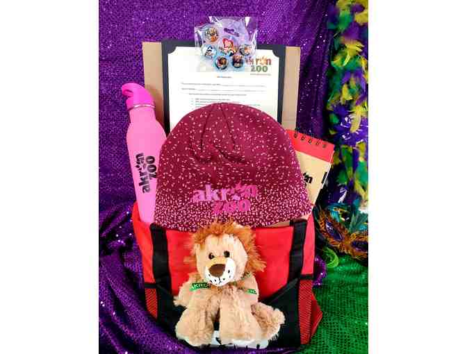 Enjoy FREE unlimited admission to the Akron Zoo with a Family Membership! This package also includes an Akron Zoo water bottle, knit beanie hat, button set, and plush lion toy.