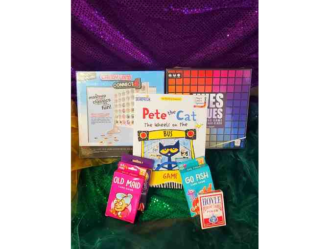 Games included: (1) Hues and Cues game, (1) Pete the Cat game, (1) Candy Land Connect 4 game, (1) UNO Flip game, (1) Old Maid game, (1) Go Fish game, (1) set of playing cards