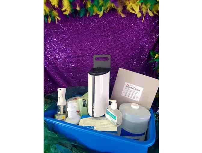 This package includes: gift certificate good for (1) Electrostatic Disinfecting Service, (1) automatic hand sanitizer dispenser with stand, (1) box gloves, (1) box of masks, (1) Husky 814 Disinfectant spray, (1) CheckMate spray bottle, Various hand sanitizers.