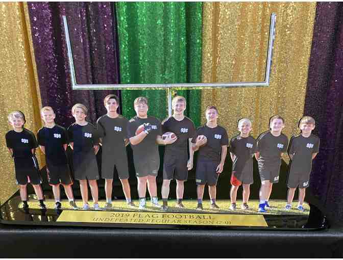Bring home the memories with this acrylic statue of the 2019 FLAG FOOTBALL UNDEFEATED REGULAR SEASON CHAMPS picture!
