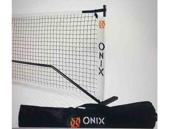Play pickleball anytime, anywhere with the 2-in-1 ONIX Portable Pickleball Net. This high-quality net is incredibly portable, while offering exceptional playability on the court. Use the net in multi-purpose gym spaces, at the local park, or even in your driveway; this portable net let's you take the game anywhere you can setup a court, but packs into a convenient, compact bag when you are done. The net is USA Pickleball (USAPA) regulation size (36"H x 22'W), making it great for tournaments or casual games. You can remove the regulation-size net and place the second 36" H x 11' W portable practice net onto the posts. Constructed of interlocking steel tubes, the ONIX Portable Pickleball Net is not only incredibly durable, but also easily assembled. The net features an adjustable Velcro strap to achieve perfect tension for exceptional playability. Also, the net features a center post to maintain regulation net height across the entire length of the court. The outstanding playability of the ONIX Portable Net is rivaled only by the ease of assembly and portability. The net quick and easily breaks down into a compact and lightweight 40" L x 7" W x 5" H bag with straps and wheels, allowing you to roll or carry the bag to its next location.