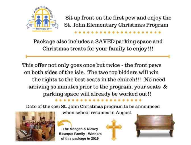 Sit up front on the first pew (on either side) and enjoy the St. John Elementary Christmas Program. This package also includes a SAVED parking space and Christmas treats for your family!!