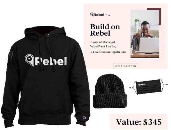 1 Rebel branded hoodie, 1 Rebel branded toque, 1 Rebel branded face mask, 1 Year of Managed WordPress Hosting for 1 website, 1 Year of Domain registration*