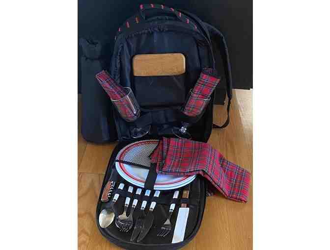 Includes: Cloth tablecloth and napkins; plates, knives, forks and spoons; insulated wine bottle holder that detaches, wine opener, and wine glasses; cheese knife and cheese board.