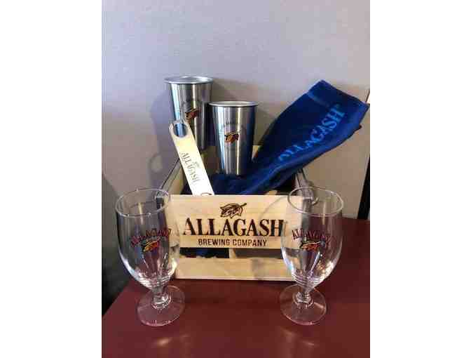 Enjoy this gift basket from Local Maine favorite Allagash Brewing Company. Basket includes a hand-crafted wooden gift crates filled with: 2 medium chalices, 2 pint cups, a bar towel and a spinner bottle opener.