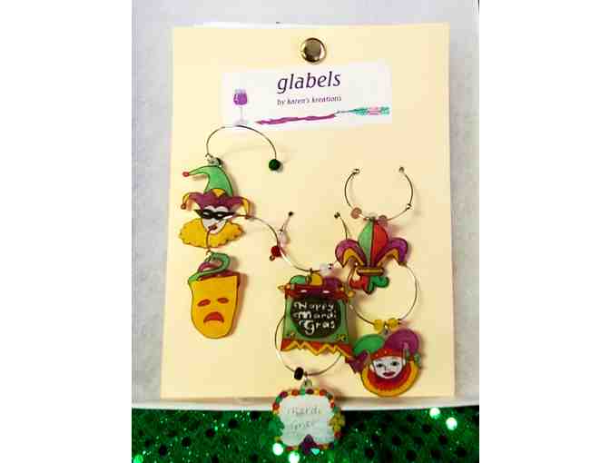 This package includes (1) $50 gift cetificate to Magna Wine Boutique in Cuyahoga Falls, (6) handmade Mardi Gras style wine charms from Karen's Kreations, and (1) $25 gift certificate for (6) custom designed wine charms from Karen's Kreations.