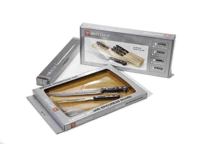 A collection of Wusthof knives including, stainless steel carving set with Epicurean cutting board, gourmet in-drawer tray set, and honing steel.