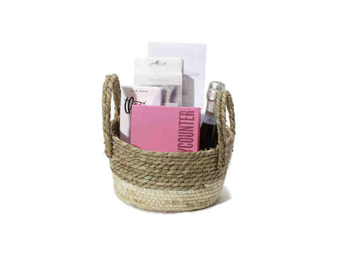 This beauty basket arrangement includes an assortment of products including Beauty Counter Glow Kit (overnight resurfacing peel and vitamin C serum), Beauty Counter Mini Facial Kit (charcoal mask, lotus cleansing balm), Spa Bella cosmetic headband, Theo chocolate and a mini bottle of LaMarca Prosecco.