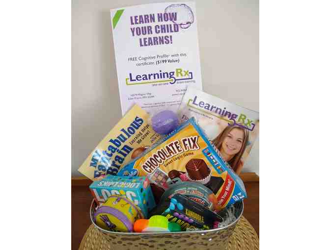 A Cognitive Skills Assessment valued at $199 and a basket of brainy games & toys and other items, including: