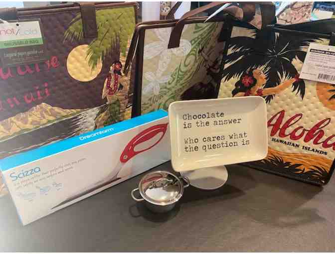 Variety Package. Three (3) insulated Hawaiian themes tote bags, pizza scissor, chocolate ceramic dish, stainless steel salt pot.