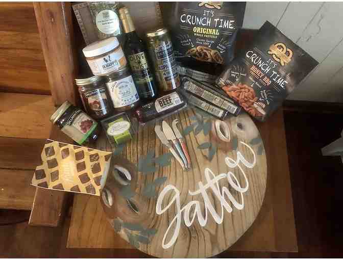 Hand painted. Comes w/3 piece cheese knife set. Also has an arrangement of various items from Indiana.