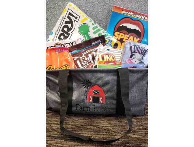 This Thirty-One tote is full of 8 family games and a huge bag of Reese's Peanut Butter Cups and M&Ms. Fun for the entire family and all your friends. The Thirty-One tote has a embroidered logo of a barn and "Farm Bureau".