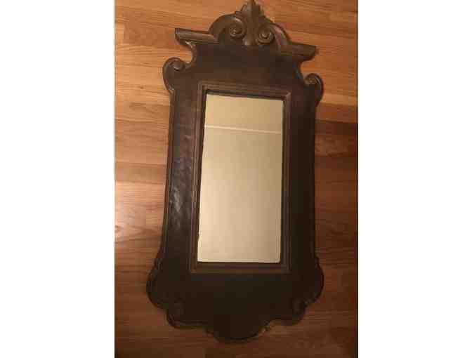Mirror with wood and leather frame. 39” long. 19” wide.