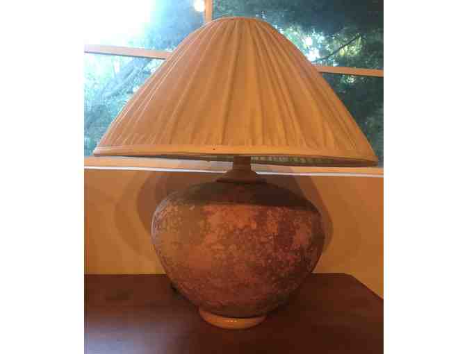 Lamp - Ceramic painted vase lamp. Wood base. Blue grey with light and dark pink. 22” tall. 20” wide shade. Will bring a distinctive look to any room.