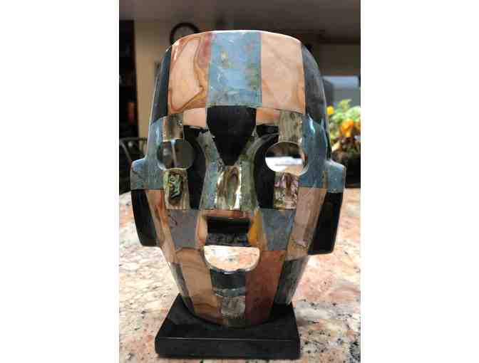 Ceramic mask on ceramic base. Many colored sections along with abalone shells. 7” tall.