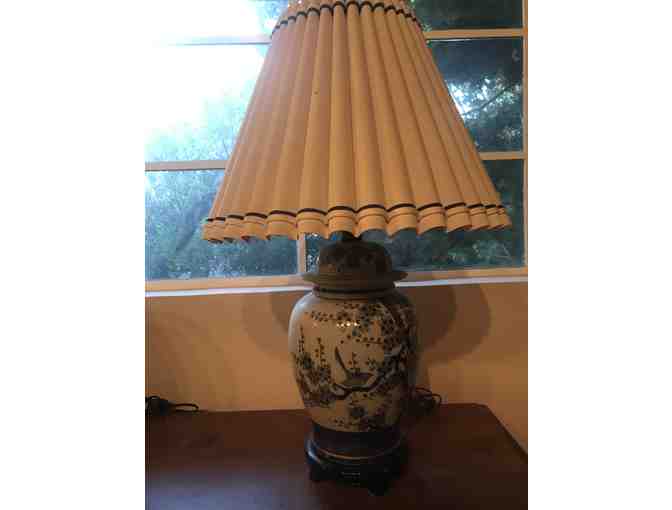 Lamp. Ceramic painted vase lamp. Wood base. Grey with dark and light blue flowers. Some gold. 32” tall. 19” wide shade. Originally a Chinese vase and converted. A traditional design to bring light into your home
