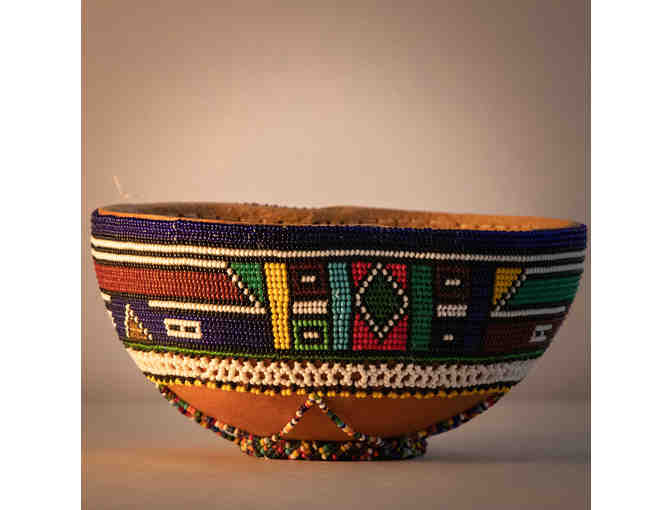Take home this gorgeous hand-made beaded bowl from Kenya. The bowl is made from a gourd and measures 4" tall and 9" wide.