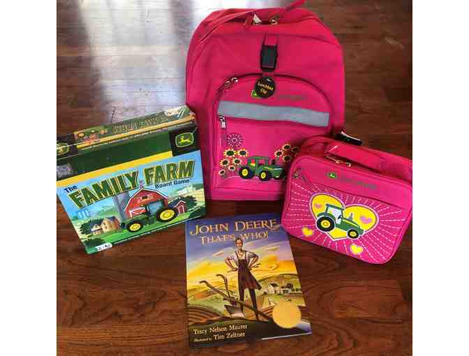 Pink John Deere BackPack & insulated lunch box. The Family Farm Board Game. and John Deere That's Who!book.