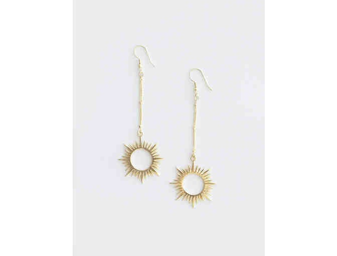 Carousel earrings in navy - made from thread and brass; Moondance necklace made from upcycled bone and brass (13.5"-15.5" in length); and Ethereal drop earrings in brass (3" in length).