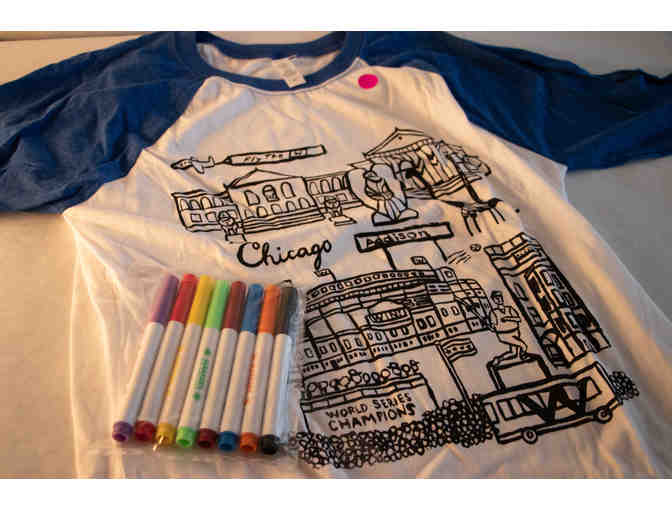 A fantastic t-shirt for kids! Features an adorable Chicago scene that they can color themselves with fabric markers (included). A great way for them to make their mark on Chicago!