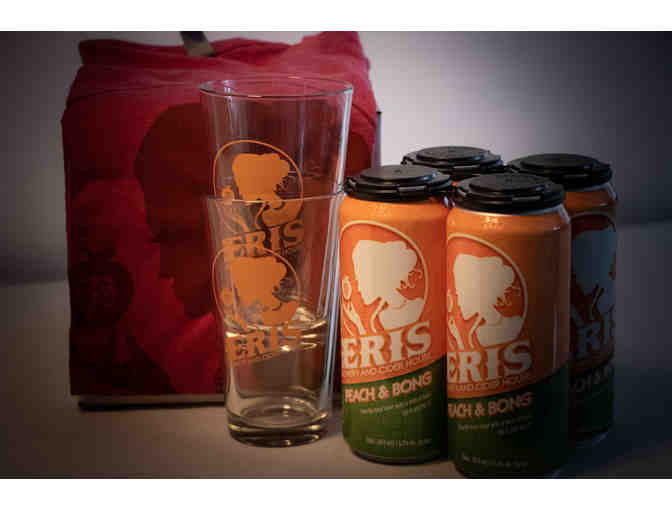 Bring a little of their cidery goodness home with this 4-pack of Eris cider, two pint glasses and beautiful Eris tee (L).