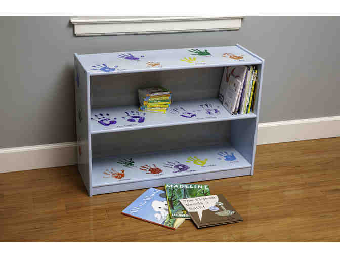 This adorable painted bookshelf with colorful handprints of students in the 5 Day AM Preschool class, is accompanied by several classic children's books and would be the perfect addition to your child's room.