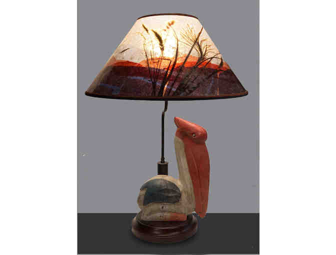 This whimsical pelican lamp from custom lamp designer Sue Johnson features an antique hand-crafted and painted wooden pelican at its base, topped with a handmade mica lampshade festooned with colored borders, lavender sprigs, and grasses that evoke the pelican's habitat.