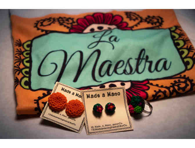 Includes a beautiful La Maestra tee (size M), orange chrysanthemum stud earrings, small succulent stud earrings, and an adorable succulent ring. All jewelry is handmade from polymer clay.