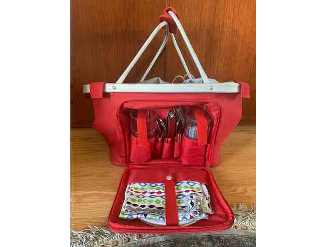 Picnic Bag. Service for 4. Red canvas. Plates, napkins, cups and silverware. Fully insulated. Comes apart from the frame for easy washing. New.