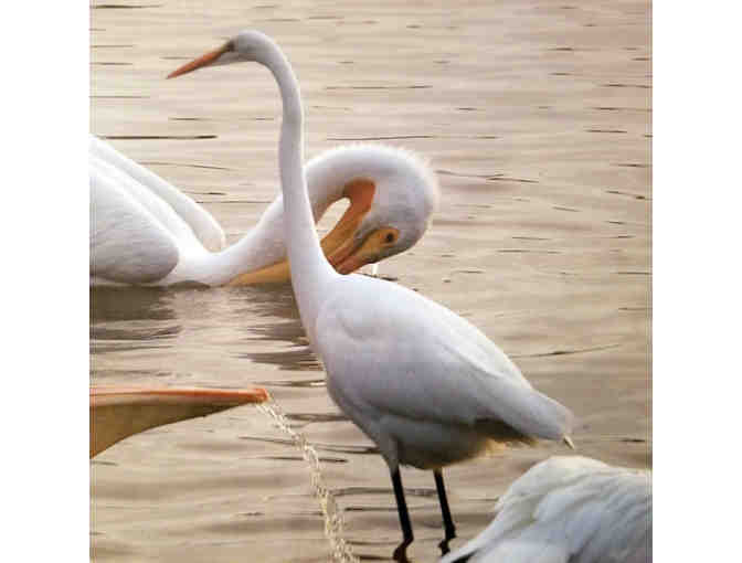 Photograph of four white pelicans and a great egret by Marin County artist Paul Bragstad.