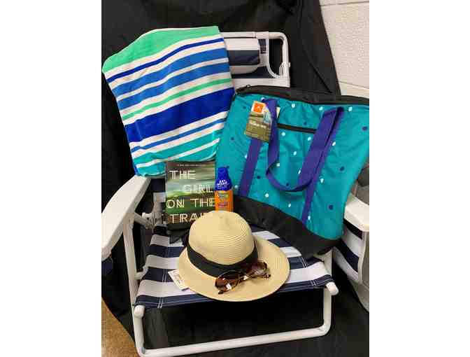 Blue and White Striped Beach Chair, Beach Towel, Book The Girl on the Train, Fashionable Straw Beach Hat, Nine West Sunglasses, Banana Boat Sunscreen