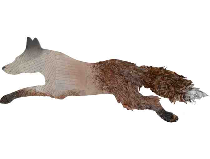 This piece showcases both the beauty of the National Sporting Library and Museum’s campus and the world class collection of art and literature inside. This fox is sporting images of an original fox hunting manuscript by President Theodore Roosevelt and leaves that were collected from the campus of this unique and much-loved facility.