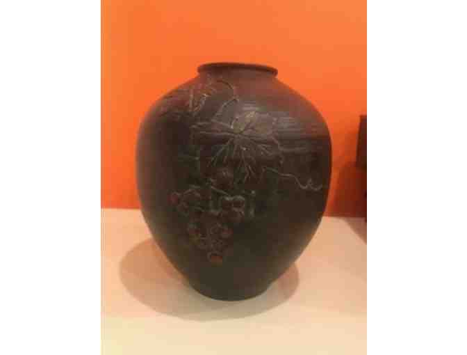 Japanese Zinc Vase stands 9 1/2" high by 8" in diameter. Raised grape and grapeleaf-embassed design all around the surface.