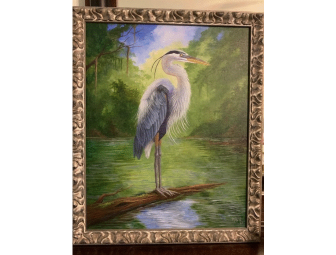 16x20 Acrylic painting of the Blue Heron by artist Robin Bickham. "In the middle of the Atchafalaya Basin patiently stands the Blue Heron. He balances himself on a fallen cypress tree ready to fish his next meal."