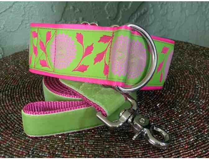 The collar comes with a matching 5ft leash made with raspberry pink webbing and apple green velvet trim. The collar can be modified to a size medium fitting a neck of 14" to 19" if the winning bidder so desires.