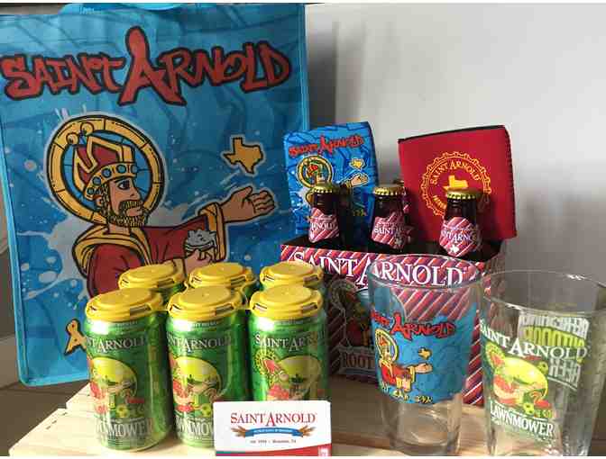 Gift bag from Saint Arnold that includes beer, root beer, 10 passes from free pints in their beer garden, Saint Arnold glassware and other fun Saint Arnold stuff.