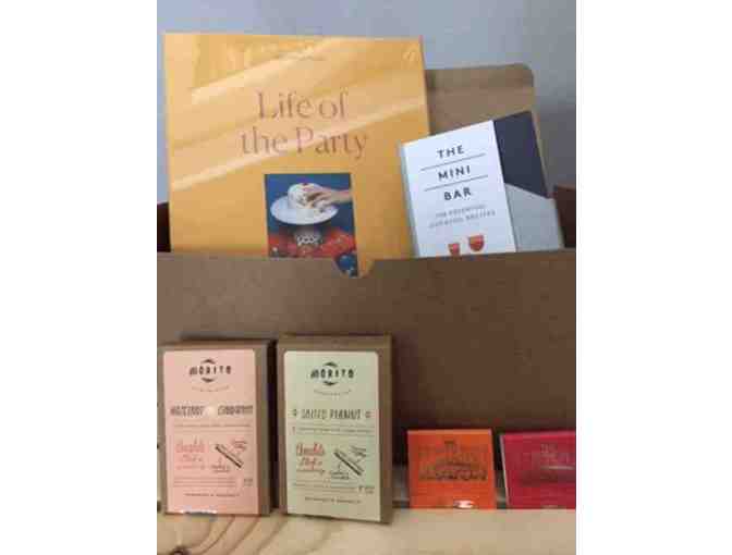 A selection of items donated by Genara. Includes Life of the Party Puzzle, chocolate sticks, incense matches and the Mini Bar set.