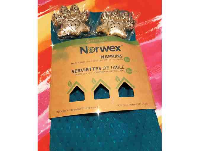 Peacock color. Recycled microfiber. Silver pawprint S & P shakers.