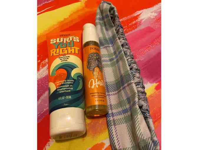 Limited edition shampoo and hair serum by Perfectly Posh, combined with a Norwex microfiber head band.