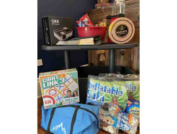 Includes everything you need for a day of family fun. Watch a movie on your inflatable sofa with the mini projector. Play a game of giant tic tac toe before eating smores, pizza and popcorn from you own machine!! Store your beer in the breeze beverage cooler and table!!