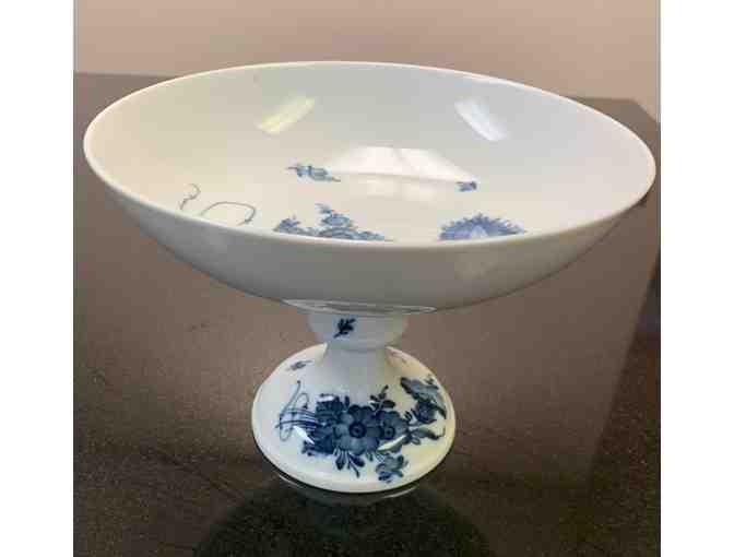 In its trademark cobalt blue design, this Royal Copenhagen pedestal bowl with a beautiful floral motif makes for a stunning centerpiece. Piece is 6" tall. Diameter of bowl is 8".