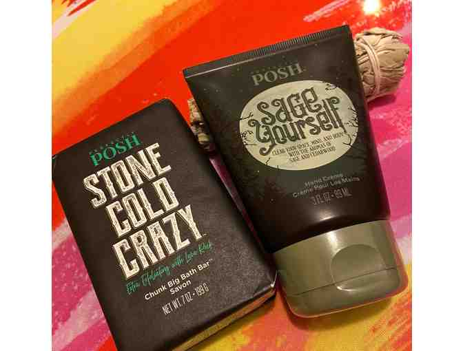 This Poshy duo will remind you that... no matter how Stone Cold Crazy life gets, you can Sage Yourself into calmness. These fragrances are earthy and unisex. A Chunk, Hand Creme, & California white sage smudge stick included.