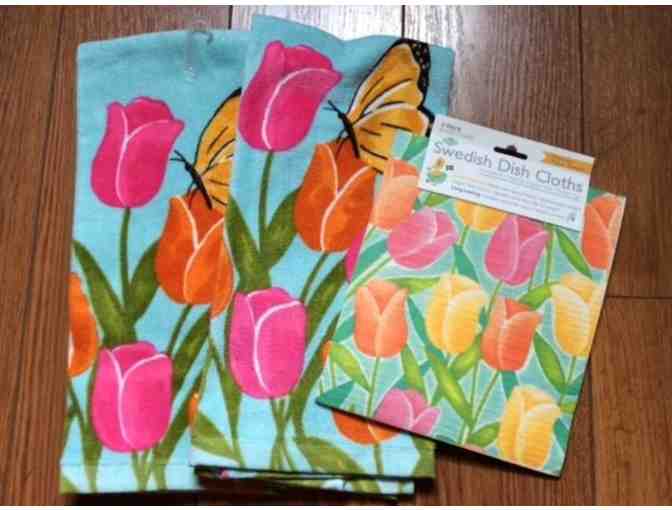 Brighten your kitchen with this pretty spring set Includes two terry cloth dish towels and two coordinating Swedish dish cloths. Swedish dish cloths soften when wet & wash & dry like a dream. Use them instead of paper towels to blot up spills -- they absorb 20x times their weight in water and dry out quicker than sponges. One Swedish Dishcloth replaces 17 rolls of paper towels.
