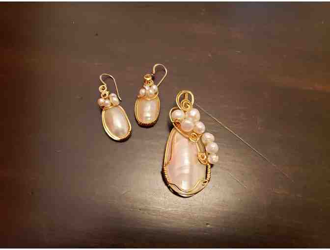 Mother of pearl and pearl hand-made gold wire wrap earrings and pendant. Handmade by jeweler in Honolulu
