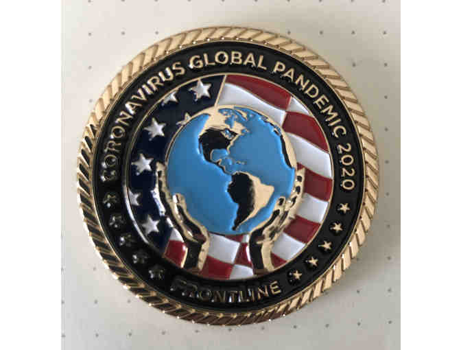 This 1.75” challenge coin features the American flag and a globe cradled in hand with the phrase “Coronavirus Global Pandemic 2020” and “Frontline” on the front. The back features the caduceus medical sysbol imposed over an image of the virus with the phrases “United by God, Country, and Service, and “Last Responder.”
