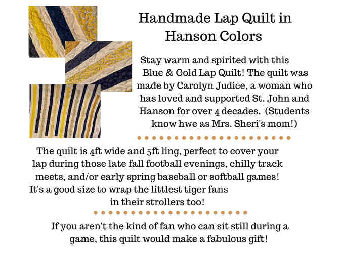 Stay warm and spirited with this Blue & Gold Lap Quilt! The quilt was made by Carolyn Judice, a woman who has loved and supported St. John and Hanson for over 4 decades. (Students know her as Mrs. Sheri's mom!)
