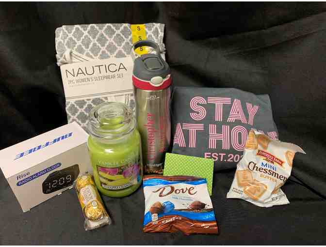 "Stay at Home" Grey Adult Small Sweatshirt, Nautica Grey print pajamas, Custom Christopher Academy Water Bottle, $25 Gift Card to Panera, Snacks, Alarm Clock/Radio, Yankee Candle