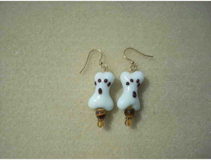 These white lamp work dog bones are accented with Tiger Eye beads and Citrine for sparkle. The earring wires are hypoallergenic.