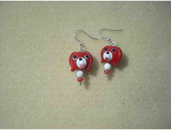 The earring wires are hypoallergenic and the red dog beads are lamp work. The white stone is Howlite with a red crystal on the bottom for some sparkle. Howlite will remove stress and tension.